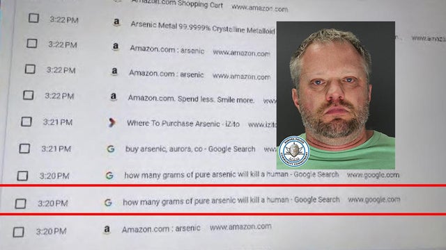 A Colorado dentist accused of killing his wife searched online for answers to questions such as "is arsenic detectable in an autopsy?" and "how to make murder look like a heart attack" a few weeks before she died, a police detective testified Wednesday.