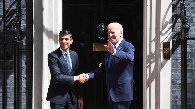 London — President Biden was in London Monday morning for a whistlestop, 24-hour visit to the United Kingdom before heading for a NATO leaders summit in Lithuania. The first meeting on Mr. Biden's agenda after his Sunday night arrival was a sit-down with U.K. Prime Minister Rishi Sunak at his residence at No. 10 Downing Street. It was the president's first in-person discussion with a fellow world leader on the European trip as the U.S. and its NATO allies look to maintain a unified voice in support of Ukraine as it battles Russia's ongoing invasion.